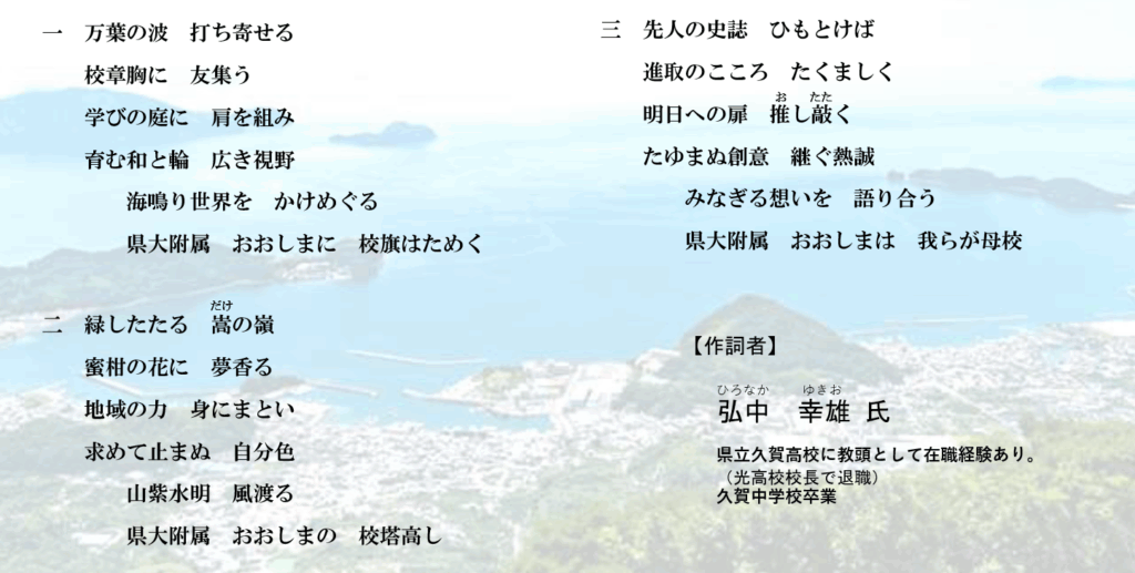 地域に支えられ地域を支える学び舎であることを踏まえて、周防大島町の歴史と伝統にふれ、その精神性を受け継ぐ内容を盛り込んでいます。