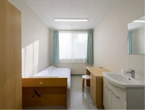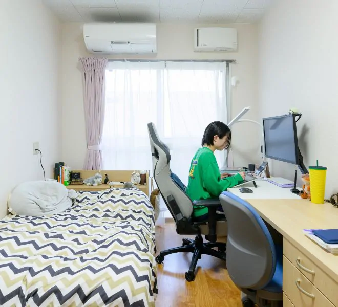完全個室で、ベッド・クローク・学習机・エアコン・カーテンを完備。浴室・シャワー室・洗面所・食堂・洗濯室のほか、学習室もあり、落ち着いた環境の中で安心して学び、充実した寮生活を送ることができます。