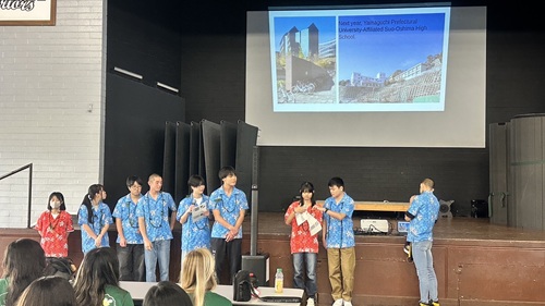 カウアイ高校ではまず、歓迎のセレモニーがありました。カウアイ島の山口県人会の方々も出席される中、校長が記念品として持参した「燦」(太陽を表すSunと同じ発音)の書を贈呈し、生徒は英語で周防大島高校の様子を紹介しました。