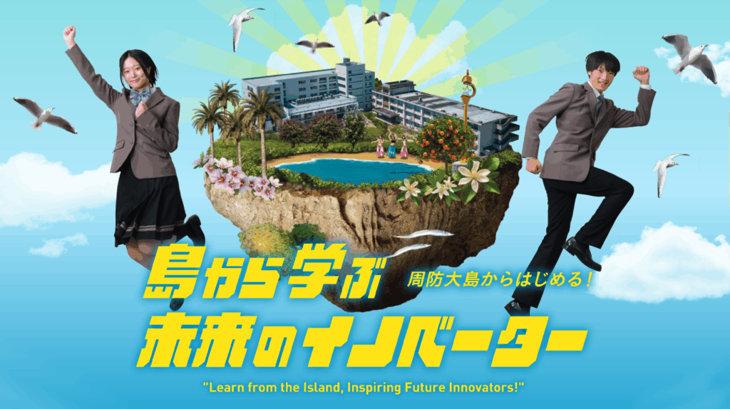 明るくてエネルギッシュなメインビジュアルと、「島から学ぶ 未来のイノベーター」というキャッチコピーで、新しい冒険が始まるようなワクワク感を表現しています。