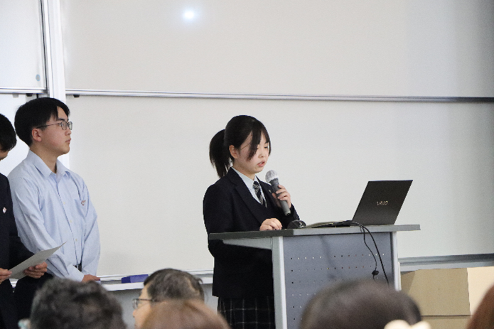 1月28日(水)に開催された最終発表会では、大学生の60を超えるアイデアのうち、「交流」、「防災」、「健康」、「環境」の各分野から2つずつ選ばれた計8つのアイデアに混じり、島高の3名の高校生が、探究学習の成果を堂々と発表してくれました。