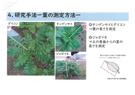 島高生の発表は、「周防大島の放置竹林の問題と解決策」という研究テーマのもと、周防大島の竹林分布域の現状と課題を整理しながら、竹炭には、水質浄化や土壌改良の効果があることから、「竹炭を利用すると、植物の成長を促すことができる」という仮説を立て、ジャガイモと大根とチンゲン菜を育てることにより、竹炭の利用による作物の成長への影響を比較したものです。